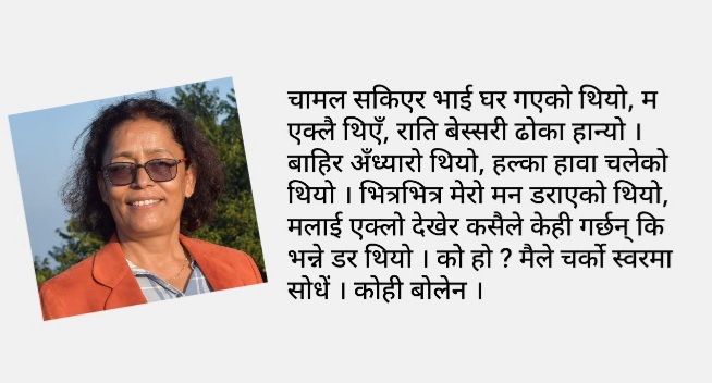 मलाई झोक चल्यो, भित्र तड्पेर बस्नुभन्दा लड्ने विचार गरें । भाइ नभए पनि उसको नाम बोलाउँदै खुर्पा मागेँ । म एक्लो नभएको आभास दिएँ उसलाई । ढोकामा हानिरहेको थियो । साहस गरें र उसले सुन्ने गरी भने, कि म मर्छु कि तँलाई मार्छु । अनि एउटा हातमा खुर्पा बोकेँ र अर्को हातले ढोका खोलेँ ।